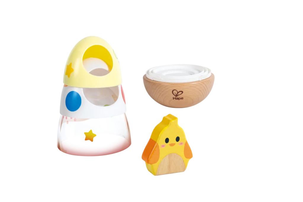 Descubre la diversión tambaleante con el Wobble Wonder Stacker de Hape. Apila las coloridas cáscaras de huevo y observa cómo se tambalean y oscilan de formas encantadoras e impredecibles. Quizá encuentres el pollo oculto también.
