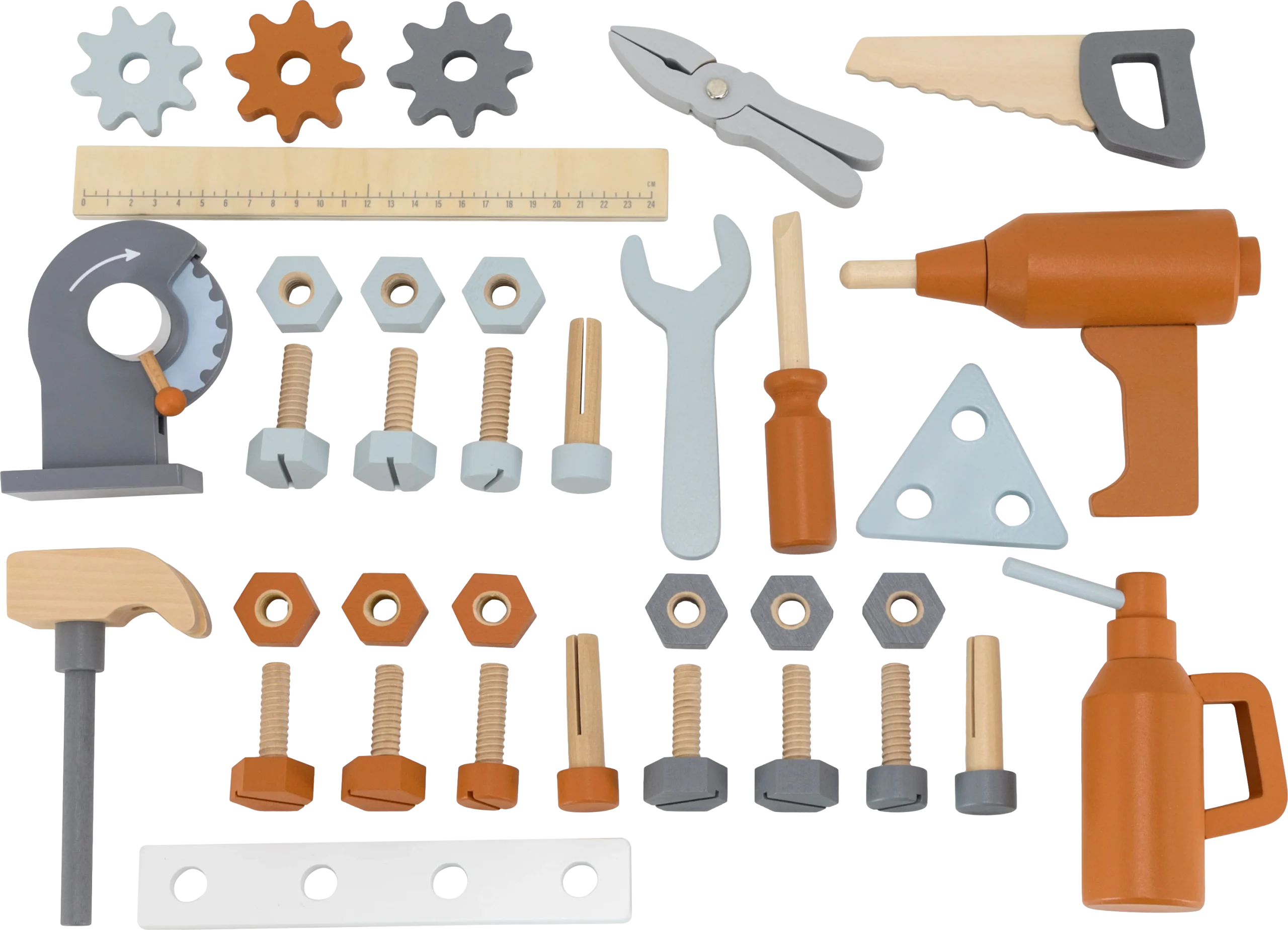 Incluye: 6 tornillos, 6 tuercas, sierra circular, llave inglesa, alicates, lata de aceite, regla, taladro, sierra, martillo, 3 engranajes y 3 formas de montaje.