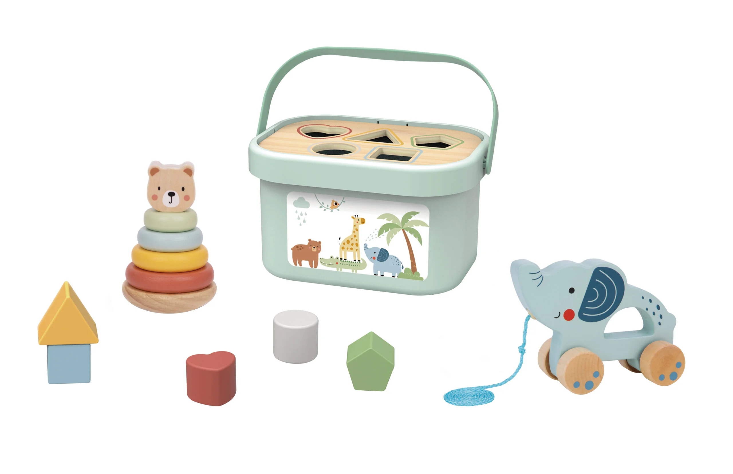 Tres juegos en uno: Arrastrable, torre de apilar y formas para encajar, perfectos para fomentar la creatividad y el aprendizaje activo.