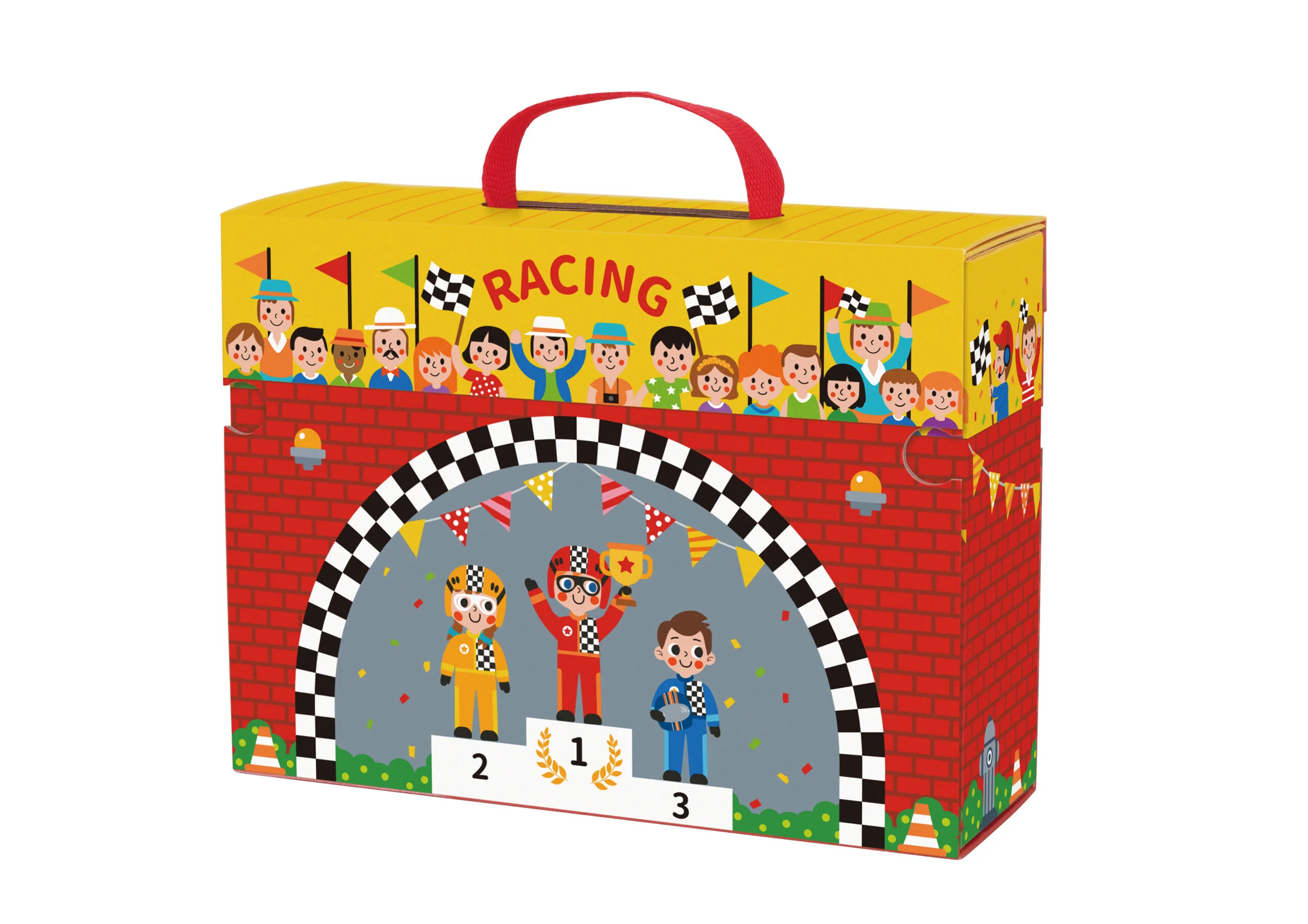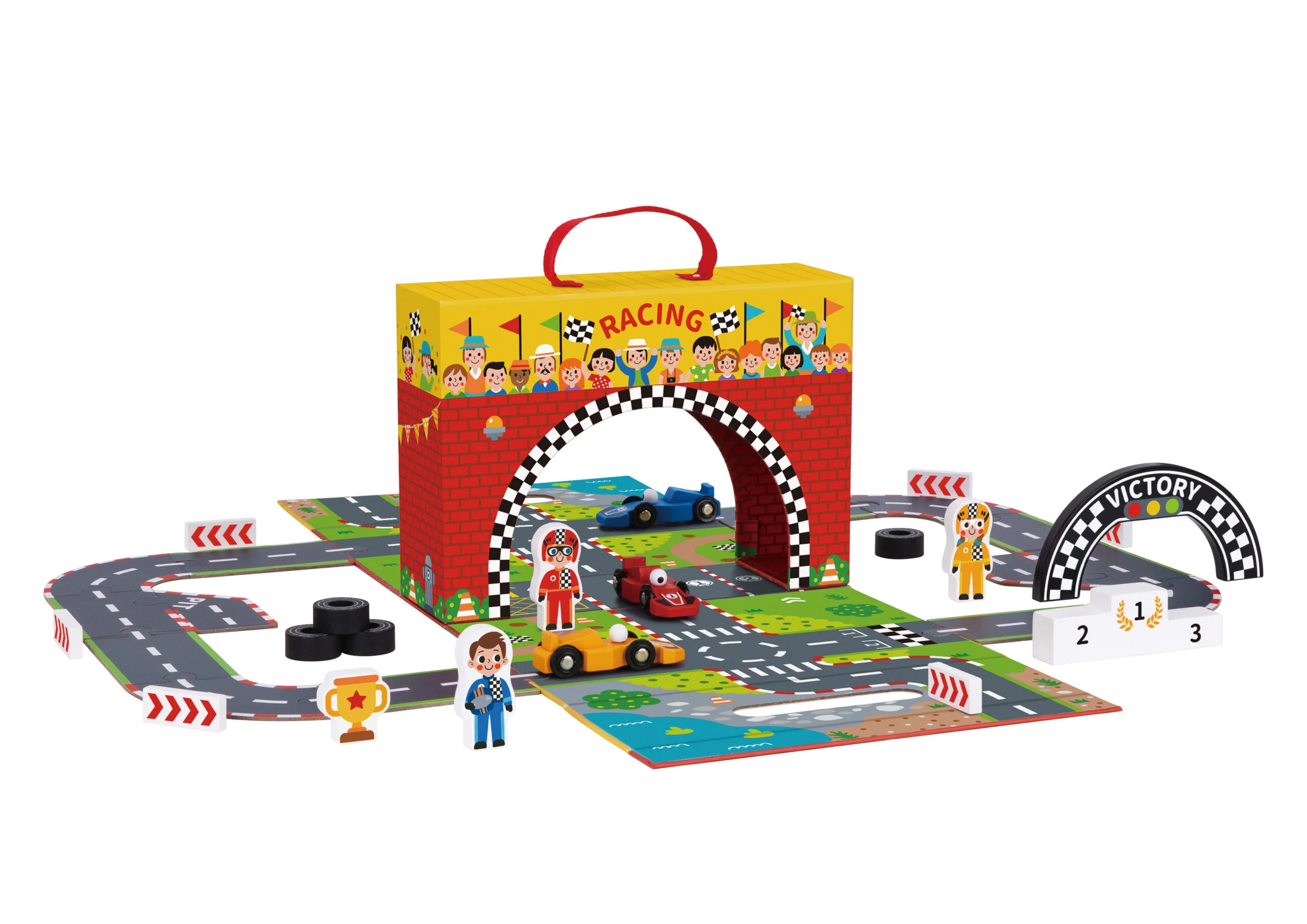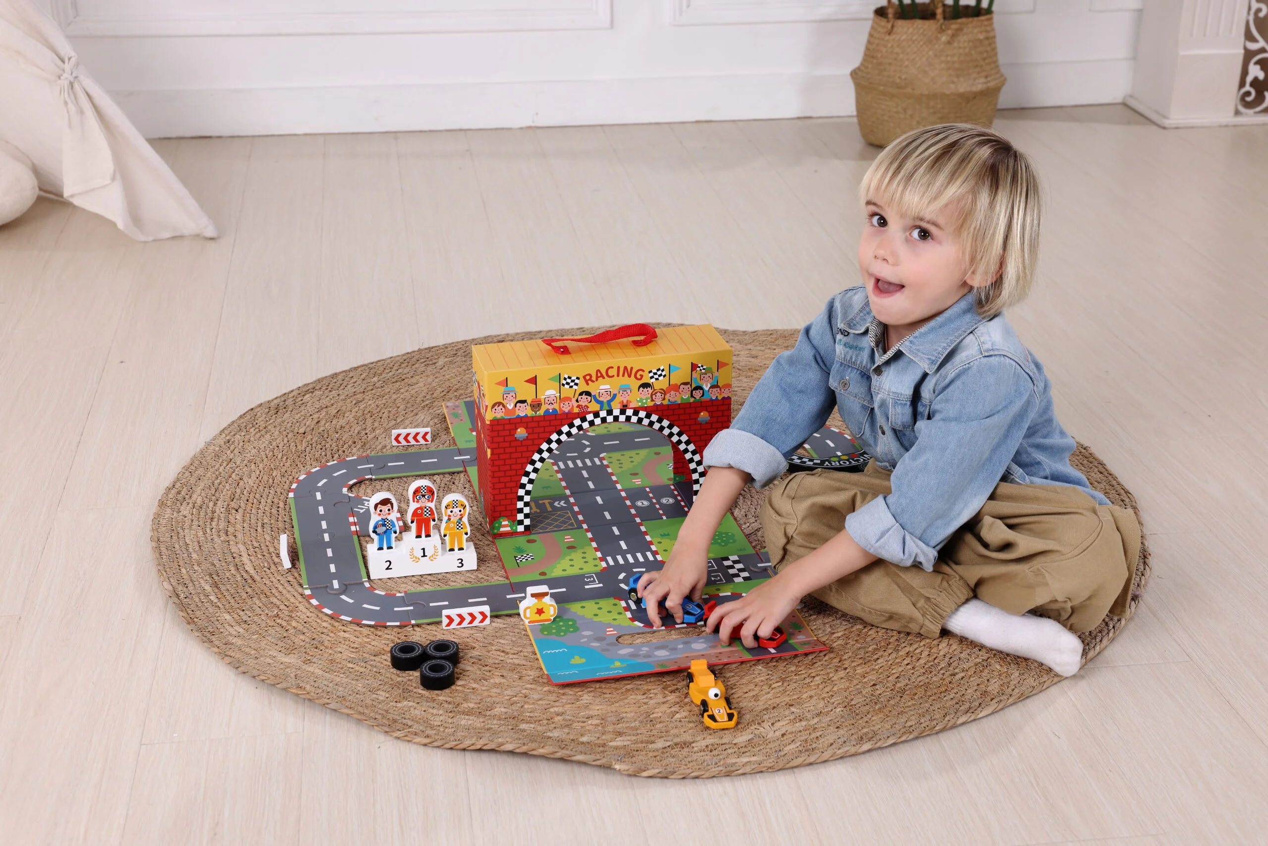 Este circuito de carreras en caja de cartón duro es ideal para niños mayores de 3 años. Al abrir la caja, se convierte en un autódromo completo con pista de carreras, listo para la acción.