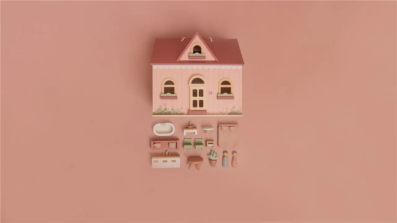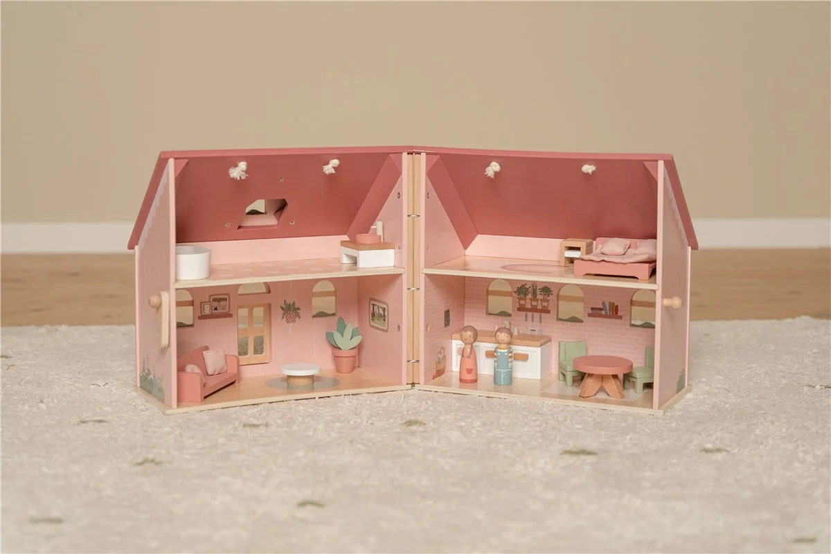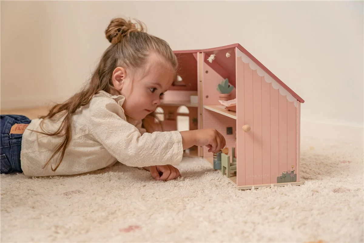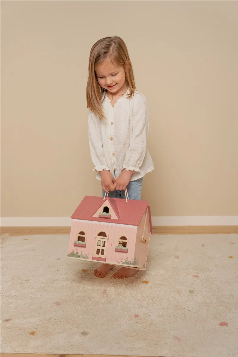 La casa de muñecas de madera portable de Little Dutch es una bonita y acogedora casa rosa con preciosos detalles. La casa tiene una sala de estar, una cocina en la primera planta, una habitación y un baño en la primera planta. Con el cierre de madera, la casa de muñecas se abre y cierra fácilmente y gracias al asa es fácil llevarla a cualquier parte. El mobiliario está incluido pero existe un set de expansión adicional para decorar la casa. La casa es perfecta para niños que adoren jugar e imaginar en su propio pequeño mundo.