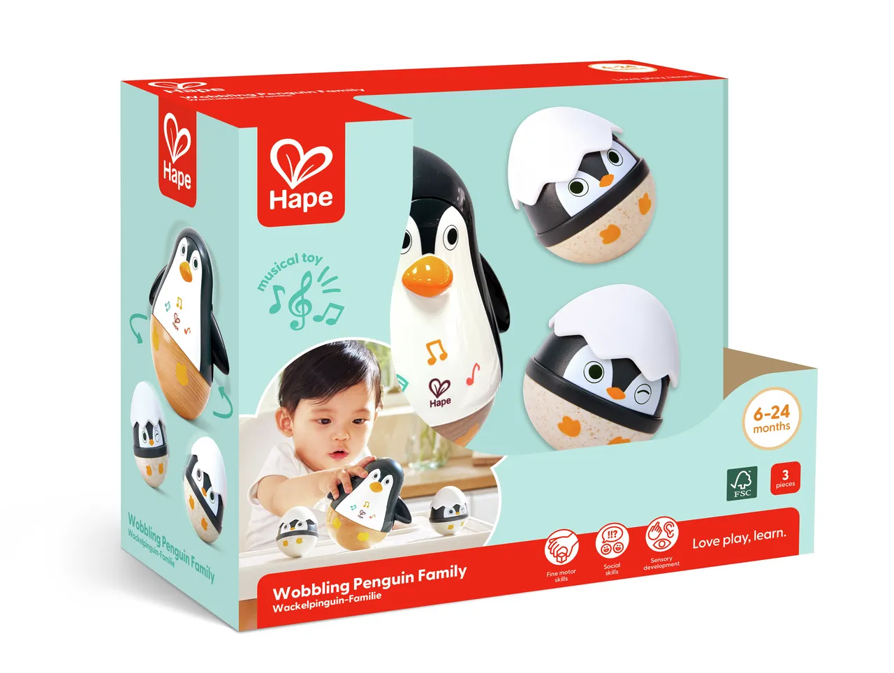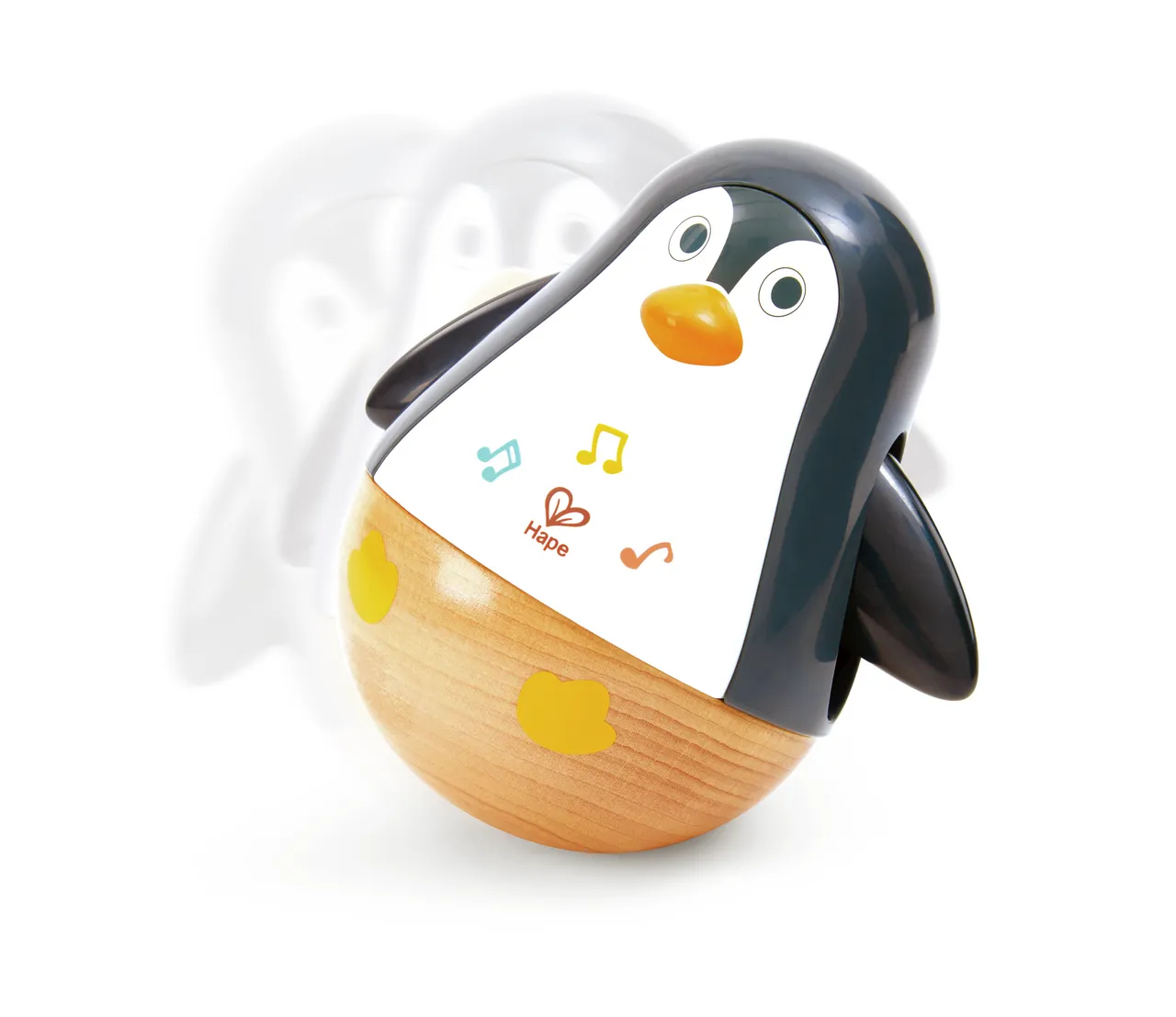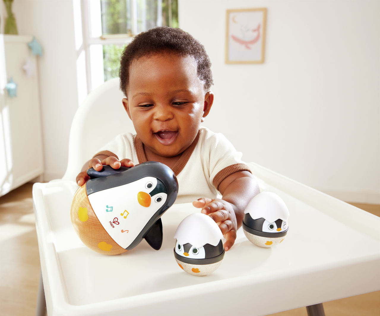 Este atractivo set de juguetes de la marca Hape,con temática de pingüinos incluye un pingüino grande que se balancea y dos huevos de pingüino más pequeños que hacen ruido, diseñados para cautivar a los bebés con sonidos y movimientos.