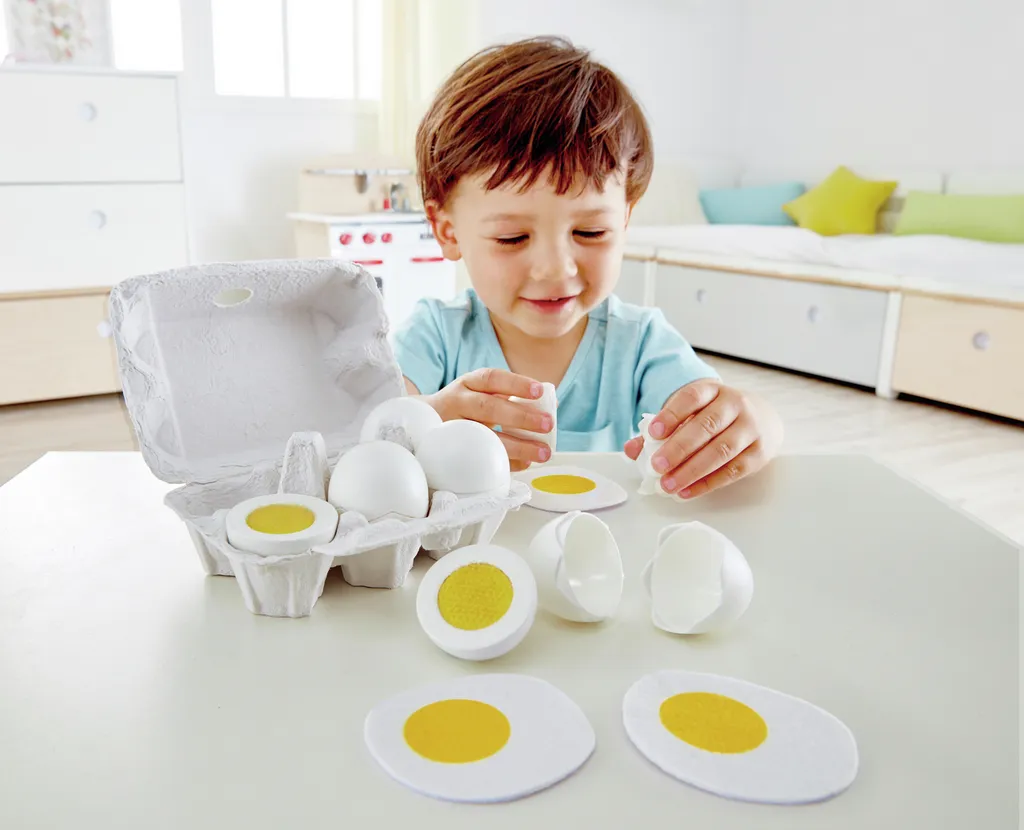 ¡Es hora de desayunar! ?? Con la Caja de huevos de juguete Hape, los pequeños chefs podrán disfrutar de un divertido y educativo juego de simulación. Este set incluye 6 huevos de juguete realistas: tres huevos cocidos y tres fritos con yema y clara, presentados en una caja similar a las reales.