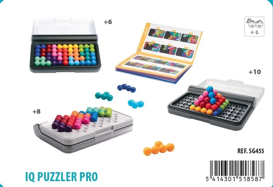 IQ Puzzler Pro, la versión actualizada del “best-seller” IQ-Puzzler: 120 desafíos y tres modos de juego diferentes, incluyendo desafíos en 2D y 3D. La parte superior del tablero incluye una superficie para los desafíos en 2D y para los desafíos piramidales en 3D y la base del tablero se convierte en una plataforma para los nuevos desafíos diagonales en 2D. Todo en el mismo estuche compacto y portátil.