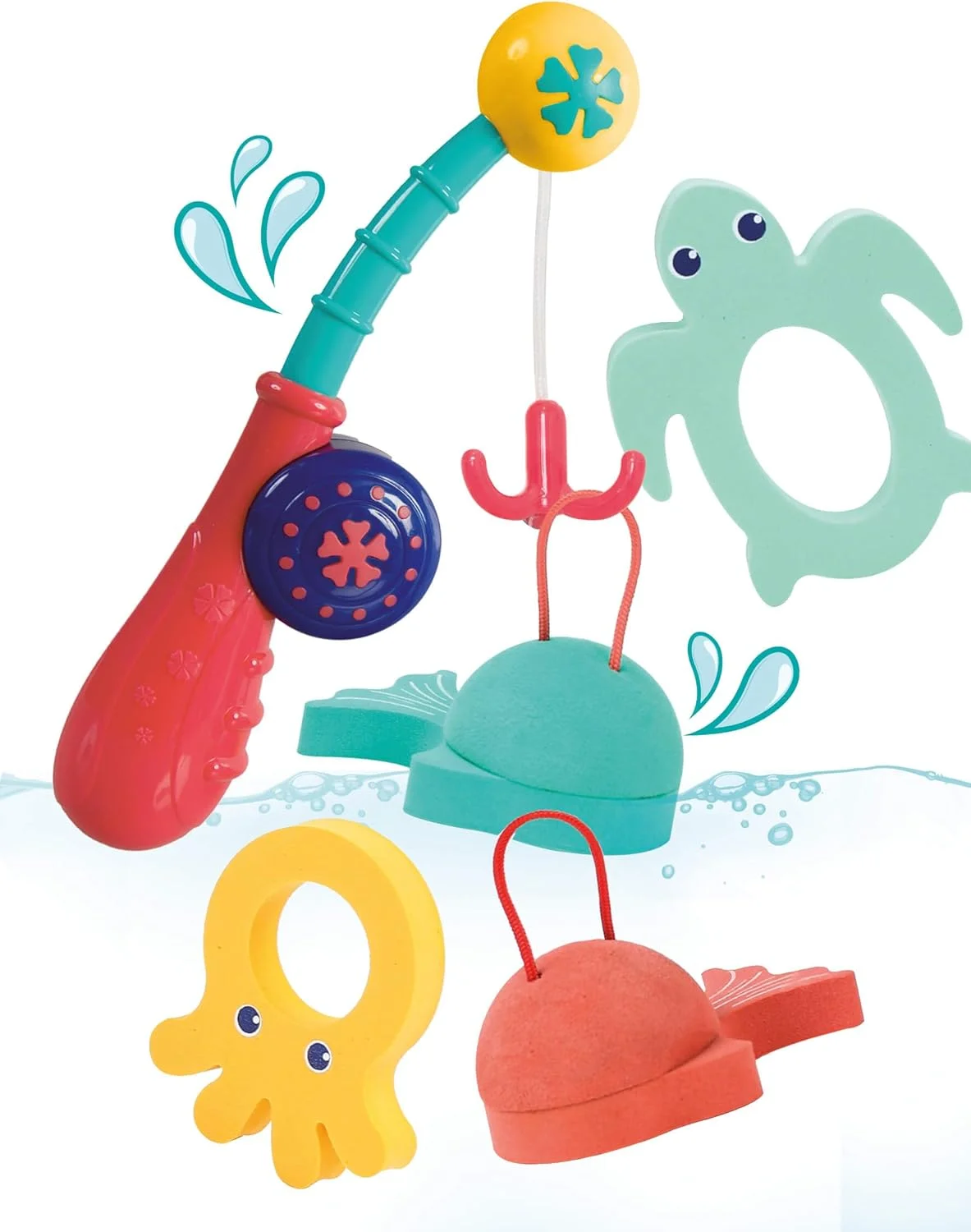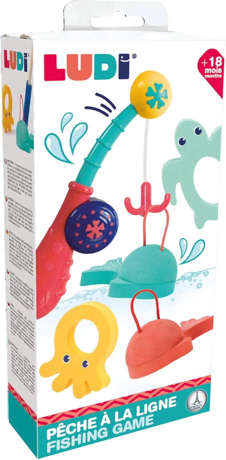 PESCA PARA BEBÉ A partir de 18 meses: Este kit de pesca de la línea LUDI para el baño contiene una caña de pesca de madera, dos peces divertidos, una tortuga y un pulpo de espuma ligero y suave.