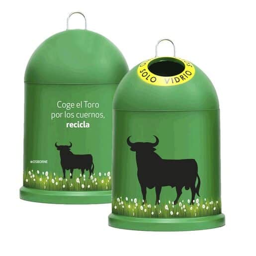 El Toro de Osborne apoya la sostenibilidad y anima al reciclaje doméstico con el clásico contenedor verde para vidrio y cristal.
