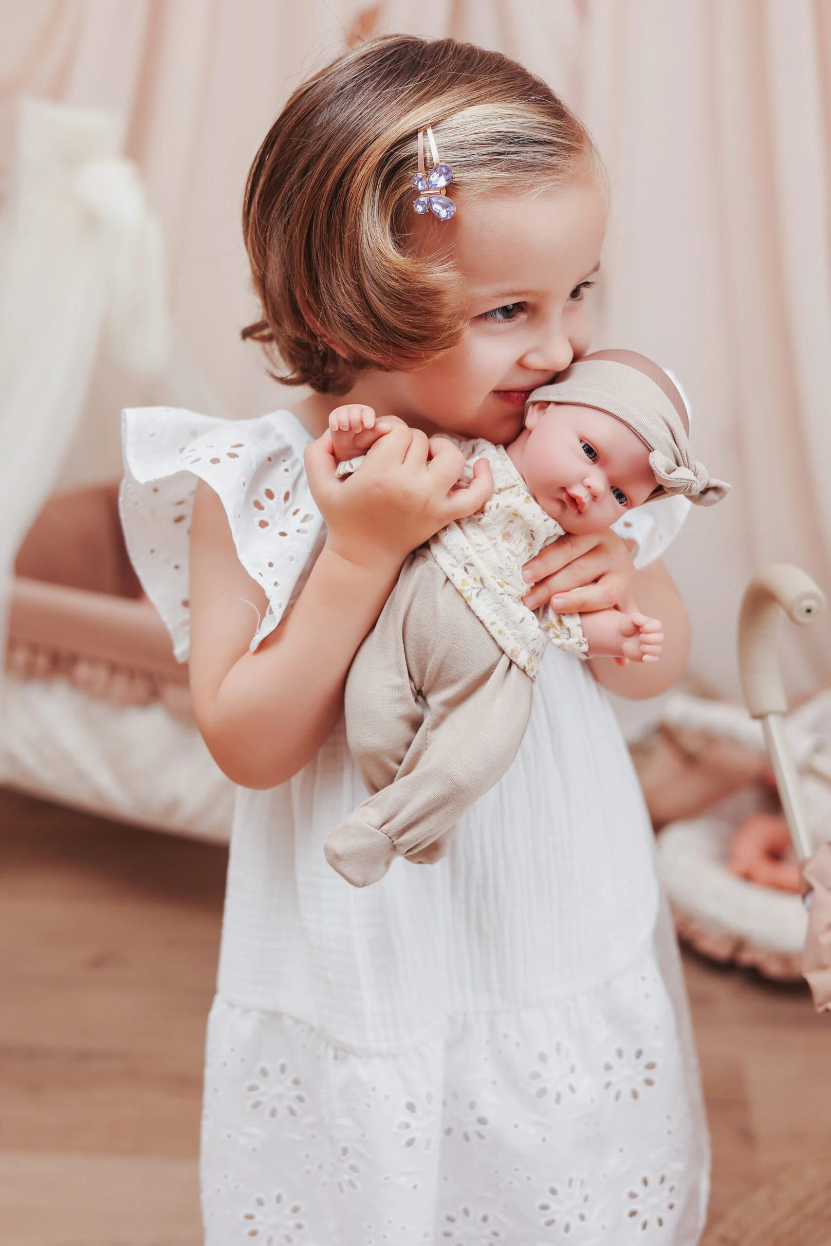 Conoce a Oli, la muñeca más achuchable de nuestra colección. Con sus 30 cm de altura, Oli se destaca por su cuerpo de tela suave y sus extremidades de vinilo, lo que la hace extremadamente ligera y perfecta para abrazar. Su diseño asegura que sea cómoda y segura para las manos pequeñas de los niños, proporcionando una experiencia de juego tierna y agradable.