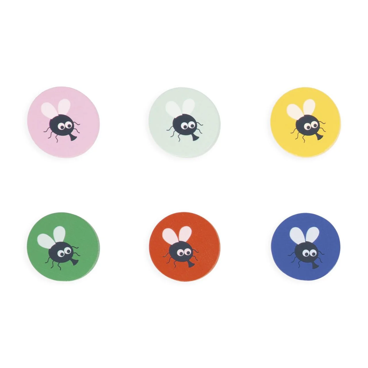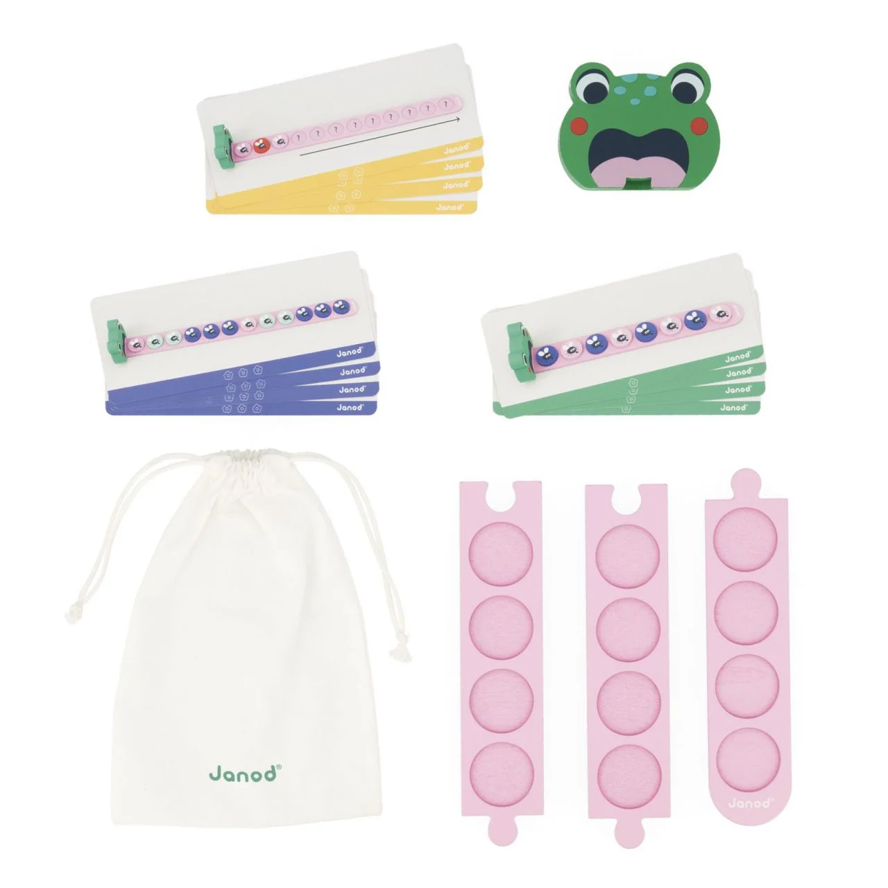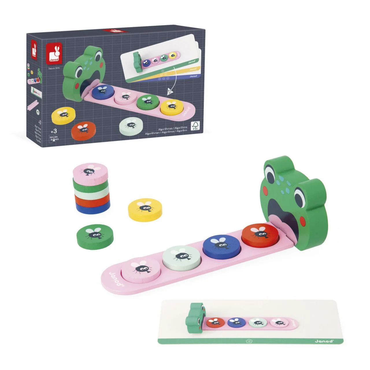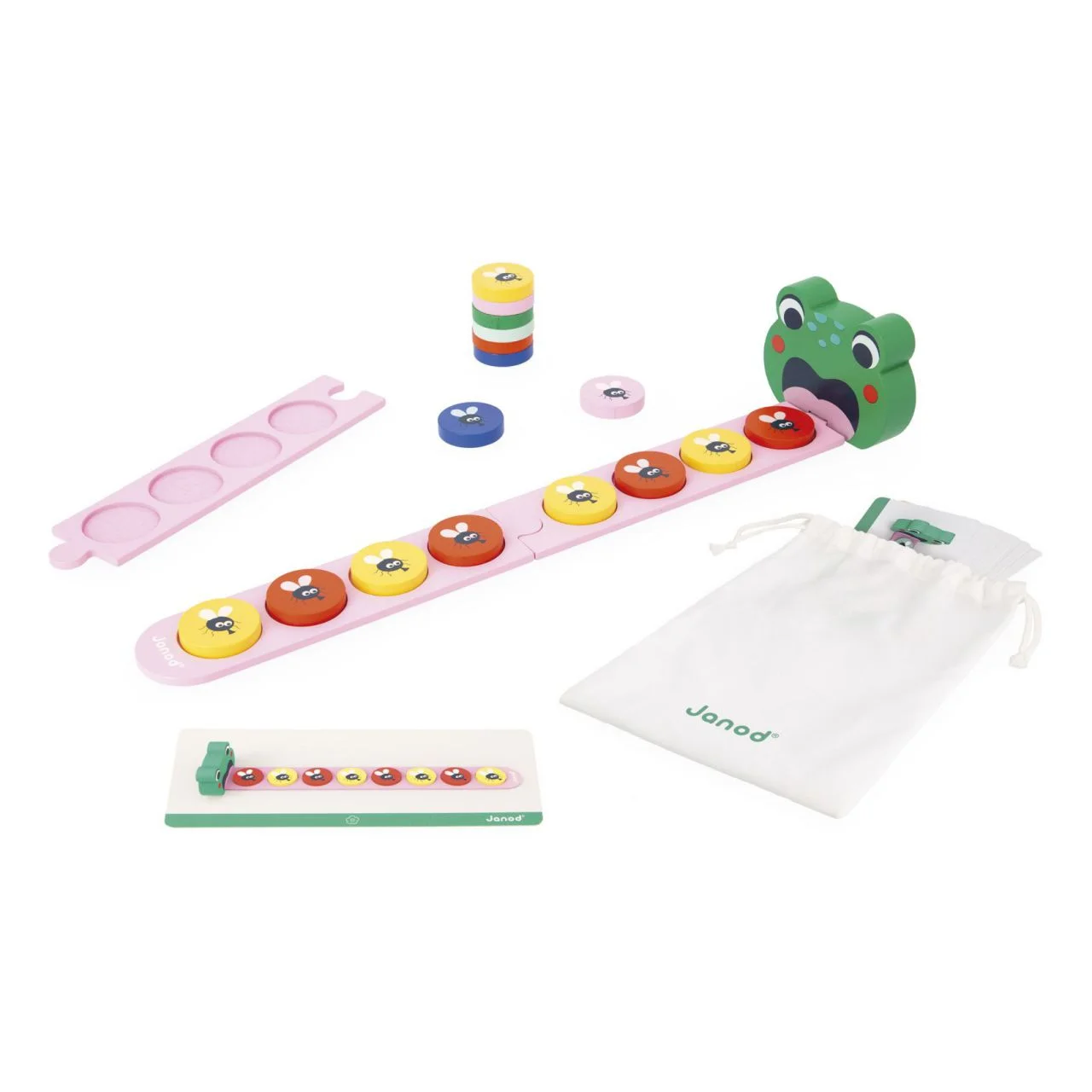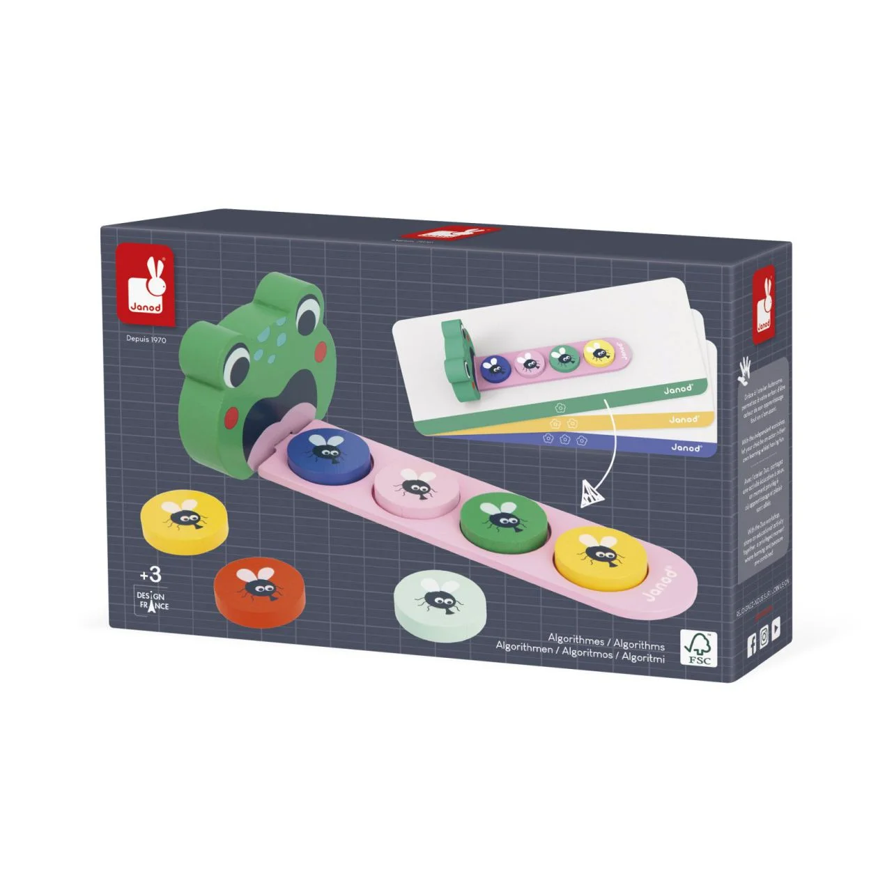 Ha llegado la hora de la comida para Froggy, la rana glotona. ¡Pero cuidado, es importante colocar bien las moscas en su lengua para que su comida sea variada…! Este juego educativo permitirá a su hijo aprender a diferenciar los colores e identificar una secuencia lógica. Ofrece 2 formas de jugar. La primera es una actividad en solitario en la que su hijo deberá reproducir una secuencia lógica de colores siguiendo las imágenes de las tarjetas. La segunda forma de jugar es una actividad en dúo: le permite acompañar a su hijo en el aprendizaje de los algoritmos, mientras comparte momentos de diversión. Este juego está compuesto por una rana de madera, una lengua dividida en 3 piezas que se unen entre sí, 36 moscas en fichas de colores y 12 tarjetas con modelos. Colocando las moscas en la lengua de la rana, su hijo aprenderá a reproducir e identificar una secuencia lógica de colores mientras se divierte. Juego de madera y cartón FSCTM. Juego educativo desarrollado en colaboración con un maestro de escuela para niños a partir de 3 años.