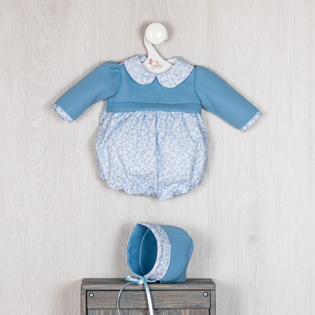 Viste a tus muñecos con este encantador pelele de flores acompañado de su capota azul, ideal para muñecos de 46 cm.