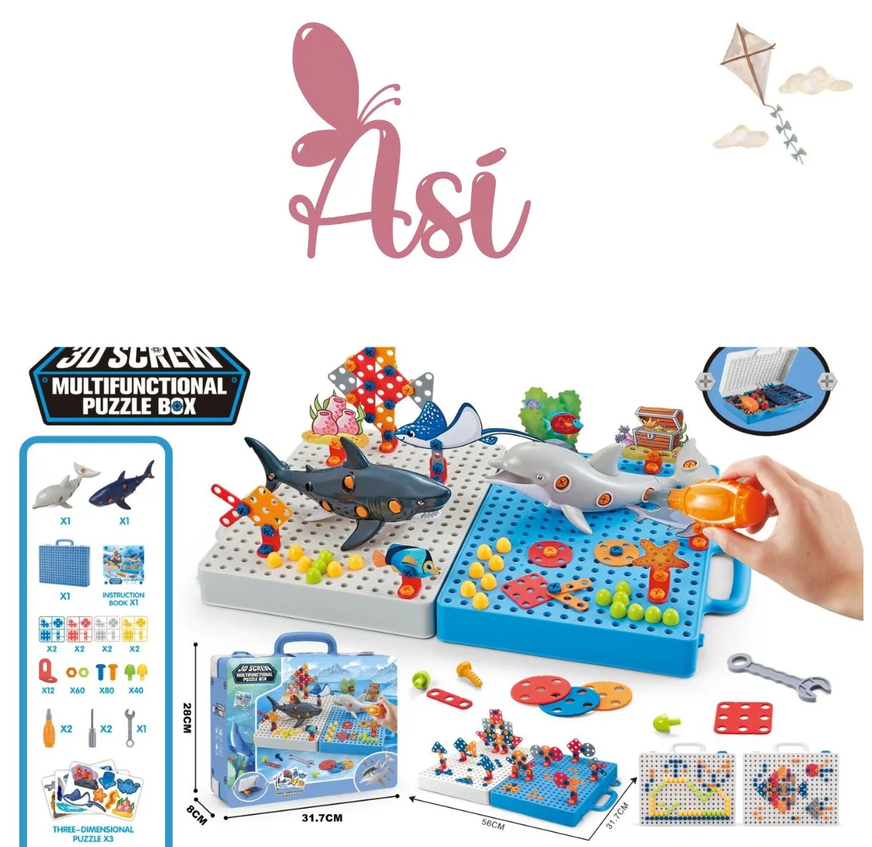 Además, incluye instrucciones para construir dos animales marinos en 3D como un divertido puzzle, estimulando la motricidad fina, la concentración y la imaginación. Ideal para un juego educativo y creativo.