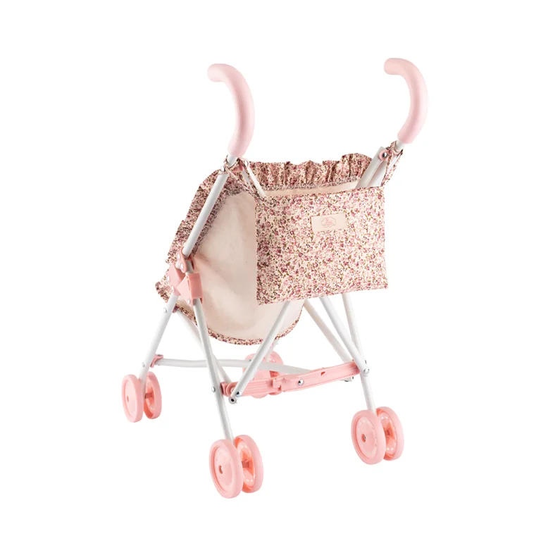 Esta silla de paseo para muñecas es perfecta para muñecas de 30 a 40 cm. Tiene un manillar de 56 cm, ideal para que los niños pequeños la manejen con facilidad. La estructura es de metal blanco resistente, y las ruedas y asas son rosas con espuma para un agarre cómodo.