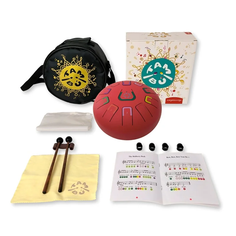 Tambor Tambú de color rojo mate con 11 lengüetas metálicas que puede tocarse con baquetas o las manos.