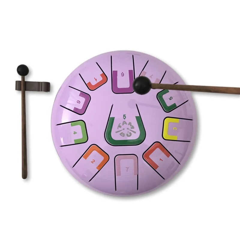 Tambor Tambú de color violeta con 11 lengüetas metálicas que puede tocarse con baquetas o las manos.