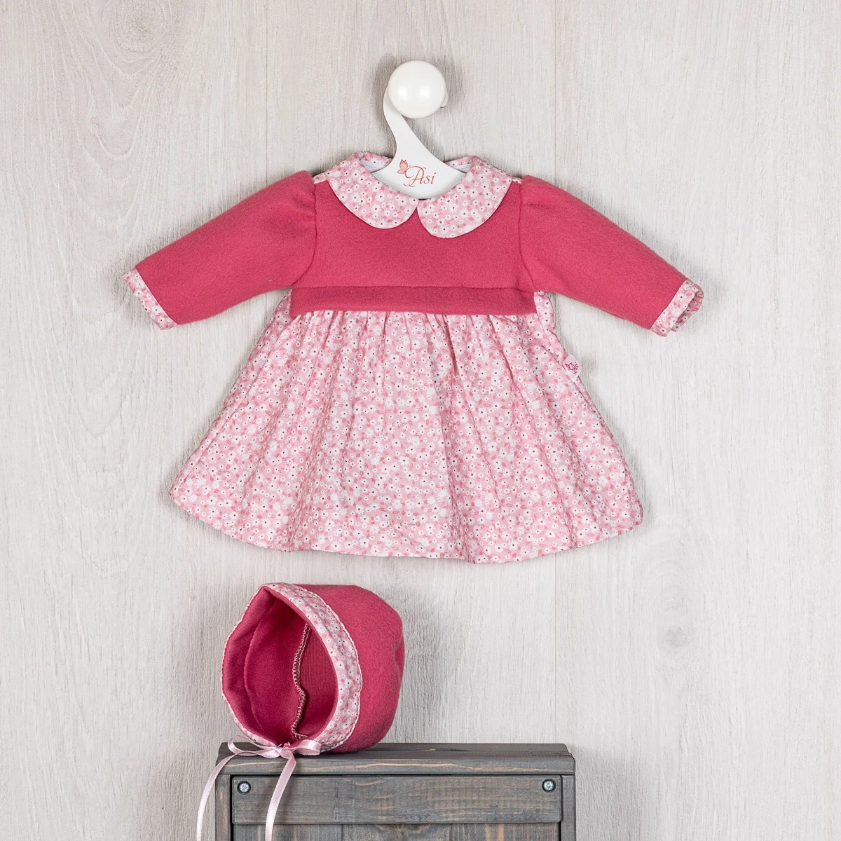 Viste a tus muñecos con este precioso vestido de flores acompañado de su capota fucsia, ideal para muñecos de 46 cm.